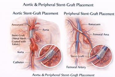 Aortic and peripheral stent-graft placement is an advanced endovascular procedure used to treat aneurysms, dissections, traumatic injuries, and complex arterial diseases affecting the aorta and major peripheral vessels.