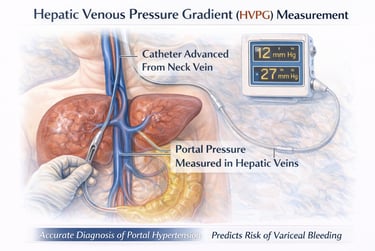 Hepatic Venous Pressure Gradient (HVPG) measurement is a minimally invasive, image-guided diagnostic procedure in which a catheter is advanced through a neck vein into the hepatic veins to directly measure portal pressure. This provides a precise assessment of the severity of portal hypertension and helps predict the risk of complications such as variceal bleeding.