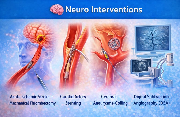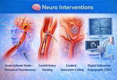 Advanced, minimally invasive, image-guided procedures for the diagnosis and treatment of disorders of the brain, spine, and blood vessels supplying the nervous system. These highly precise interventions address conditions such as stroke, aneurysms, vascular malformations, and intracranial bleeding, aiming to restore blood flow, prevent hemorrhage, reduce neurological damage, and improve outcomes with faster recovery and reduced risk compared to open neurosurgery.