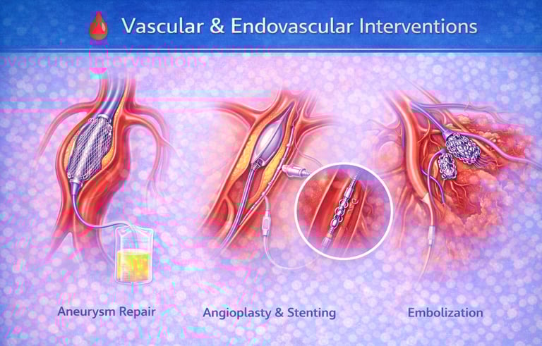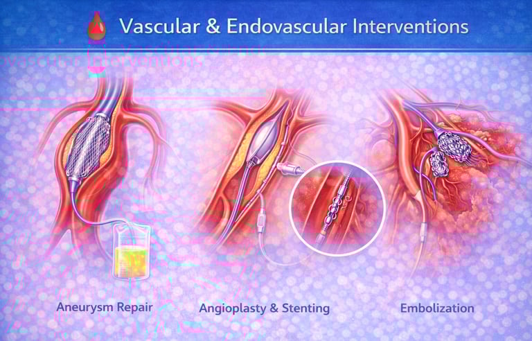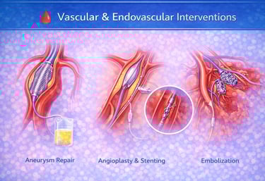 Comprehensive, minimally invasive treatments for diseases of the arteries and veins using advanced image guidance. These procedures help restore blood flow, treat blockages, aneurysms, and vascular malformations, reduce pain and complications, and enable faster recovery with minimal risk compared to open surgery.