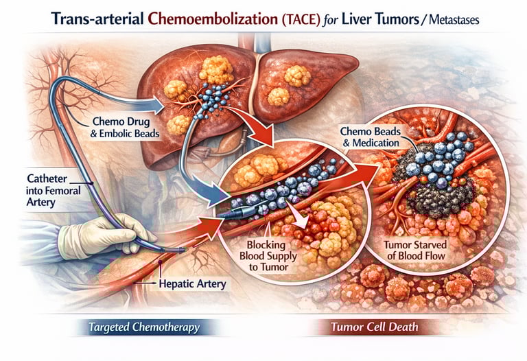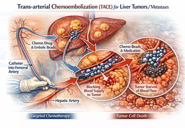 A targeted, image-guided cancer therapy that delivers chemotherapy directly into tumor-feeding arteries while blocking blood supply, helping shrink or control liver tumors and metastases while minimizing systemic side effects.