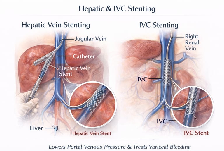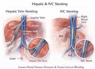 Hepatic vein and IVC stenting is a minimally invasive, image-guided procedure in which expandable metal stents are placed to reopen narrowed or blocked veins and restore normal blood flow. This treatment provides rapid symptom relief, improves liver function, avoids major surgery, and offers durable long-term outcomes with faster recovery and reduced procedural risk.