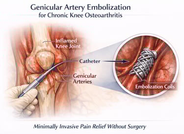 A minimally invasive, image-guided treatment that reduces abnormal blood flow to inflamed knee tissues, helping relieve chronic pain and improve mobility without surgery.