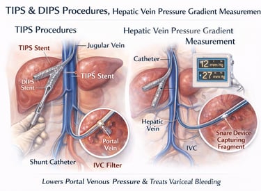 TIPS and DIPS are advanced, minimally invasive, image-guided procedures that create a controlled channel (shunt) within the liver to redirect blood flow from the portal vein into the systemic circulation. This reduces high portal pressure and relieves complications associated with portal hypertension when medical or endoscopic treatments are insufficient.