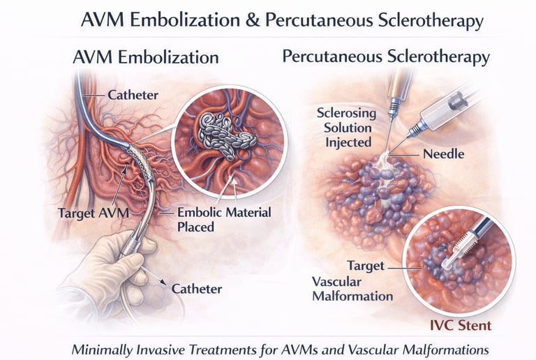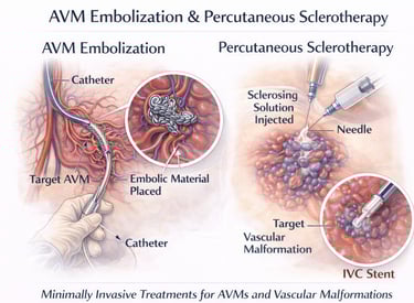 AVM embolization and percutaneous sclerotherapy are minimally invasive, image-guided treatments that block abnormal blood flow using embolic agents or sclerosing medications, helping reduce symptoms, control bleeding, and preserve surrounding healthy tissue without open surgery.