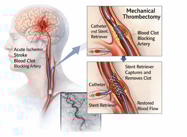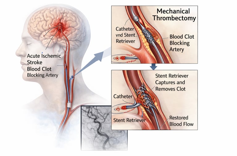 A life-saving, image-guided emergency procedure to rapidly remove a clot from a blocked brain artery, restore blood flow, and limit brain damage—significantly improving chances of recovery when performed promptly.