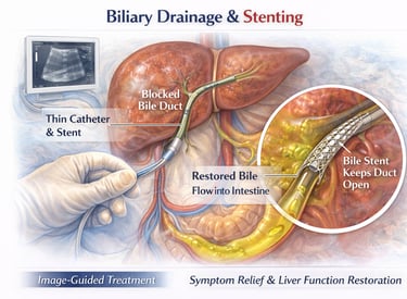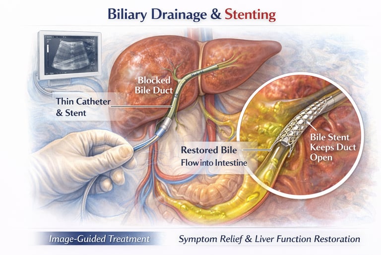 Biliary drainage and stenting are minimally invasive, image-guided procedures in which a thin catheter and stent are placed into the blocked bile ducts under ultrasound and fluoroscopic guidance. This restores the normal flow of bile from the liver into the intestine, relieving pressure and improving liver function.