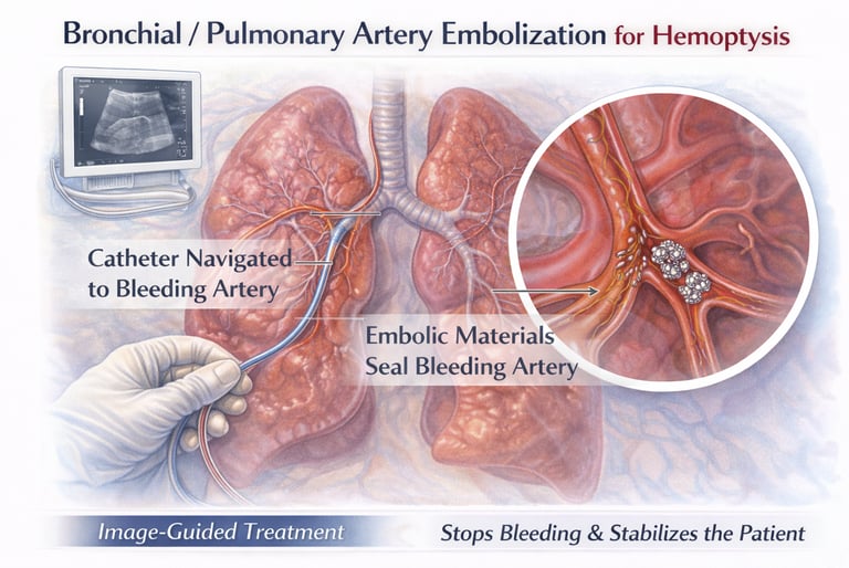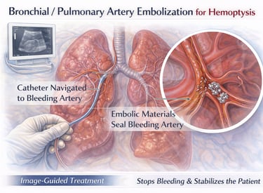 A rapid, image-guided procedure to precisely block bleeding bronchial or pulmonary vessels, providing effective control of massive or recurrent hemoptysis while preserving lung function and avoiding emergency surgery.