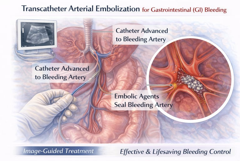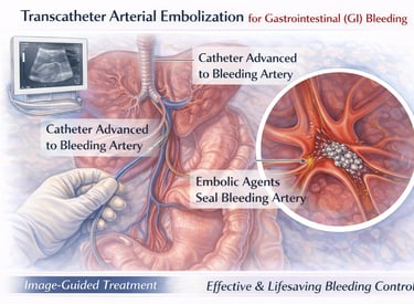 A minimally invasive, image-guided procedure that precisely targets and seals bleeding vessels in the gastrointestinal tract, enabling rapid hemorrhage control, hemodynamic stabilization, and avoidance of high-risk emergency surgery.
