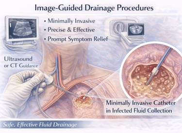 Image-guided drainage procedures are minimally invasive techniques in which ultrasound or CT guidance is used to precisely place a catheter into the fluid collection. This allows effective drainage while avoiding injury to surrounding organs and tissues.