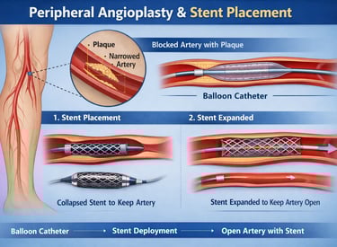 Peripheral angioplasty and stent placement is a minimally invasive, image-guided procedure in which narrowed arteries are widened using balloon angioplasty and supported with stent deployment to restore blood flow. This treatment helps relieve symptoms, improve walking ability, promote wound healing, and prevent limb-threatening complications, offering faster recovery and reduced risk compared to surgery.