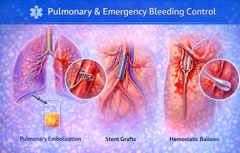 Advanced, image-guided minimally invasive treatments for rapid control of acute, life-threatening bleeding involving the lungs and major blood vessels. These procedures effectively manage massive hemoptysis, trauma-related hemorrhage, post-surgical and tumour-related bleeding, as well as vascular injuries—providing swift stabilization, organ preservation, and a safe alternative to emergency surgery with improved patient outcomes.