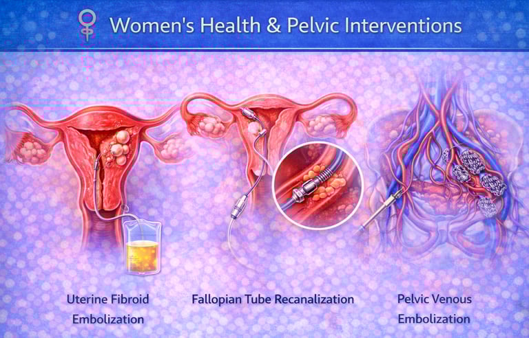Advanced, minimally invasive, image-guided treatments for a wide range of gynecological and pelvic conditions. These procedures help control symptoms such as pain, heavy bleeding, and pelvic discomfort while preserving the uterus and ovaries, reducing hospital stay, and enabling faster recovery compared to conventional surgery.