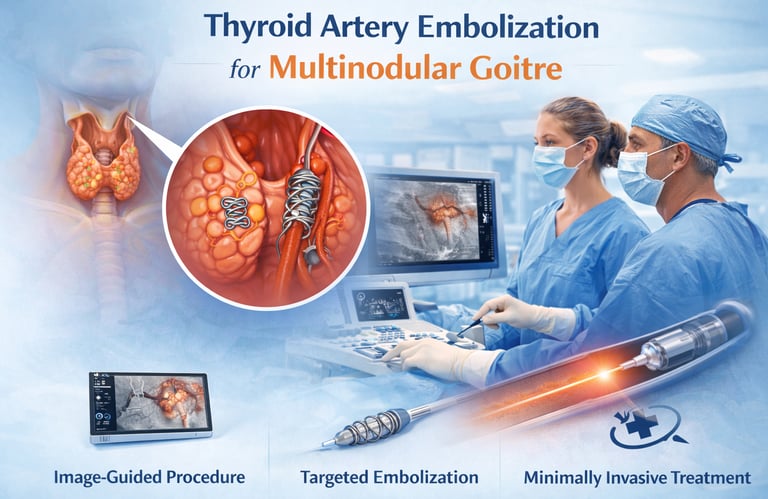 An advanced, minimally invasive, image-guided treatment in which targeted embolization of thyroid arteries reduces blood flow to enlarged nodules. This leads to gradual shrinkage of the multinodular goitre, improvement in compressive and cosmetic symptoms, and preservation of surrounding structures—providing a safe and effective non-surgical alternative for patients who are high-risk for or unwilling to undergo surgery.