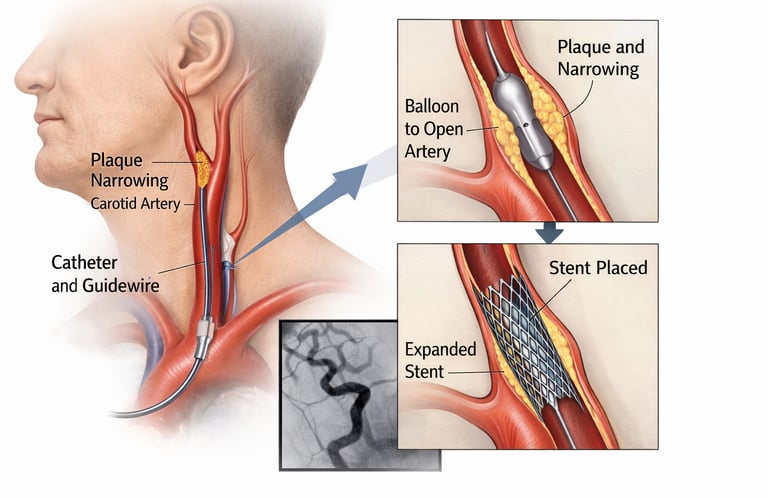 Carotid artery stenting is a minimally invasive, image-guided procedure in which a stent is placed to widen the narrowed artery and restore normal blood flow to the brain. This treatment helps reduce stroke risk, is especially beneficial for high-risk surgical patients, and offers faster recovery with less discomfort compared to open surgery.
