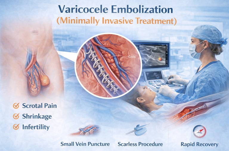 A safe, image-guided procedure that blocks abnormal testicular veins to relieve pain, reduce scrotal swelling, and improve sperm parameters, offering a non-surgical alternative with quick recovery and no incisions.