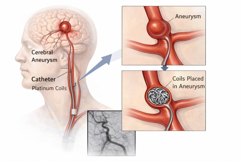 A minimally invasive, image-guided endovascular procedure that fills and seals brain aneurysms with tiny coils, preventing rupture or re-bleeding while avoiding open brain surgery and reducing recovery time.