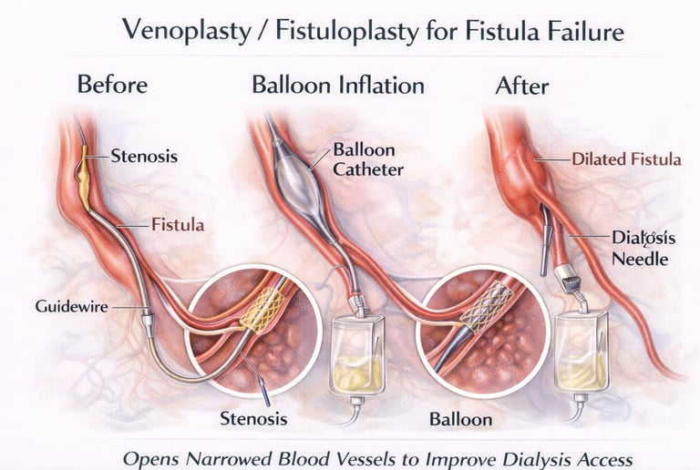 Venoplasty or fistuloplasty is a minimally invasive, image-guided procedure used to treat narrowing or blockage of arteriovenous fistulas in patients undergoing hemodialysis, which can lead to poor flow, difficult cannulation, or fistula failure.