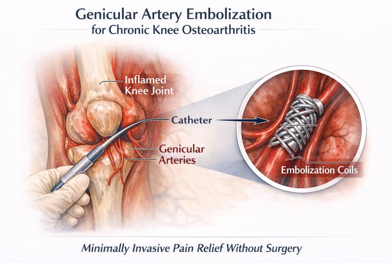 Genicular Artery Embolization is a minimally invasive, image-guided procedure that targets abnormal inflamed blood vessels around the knee responsible for pain. By selectively reducing this abnormal blood flow using tiny embolic particles, the procedure helps decrease inflammation, relieve pain, and improve joint function. GAE is a non-surgical option for patients who have persistent symptoms despite conservative treatment and wish to delay or avoid knee replacement surgery.