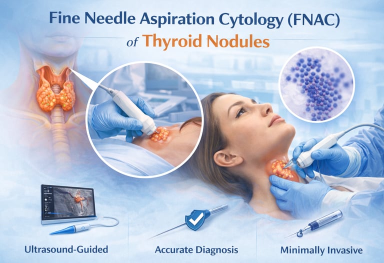 An accurate, minimally invasive diagnostic procedure performed under ultrasound guidance to sample cells from thyroid nodules. FNAC helps differentiate benign from malignant lesions, guides treatment planning, and reduces unnecessary surgery, while being quick, safe, and well tolerated with minimal discomfort.