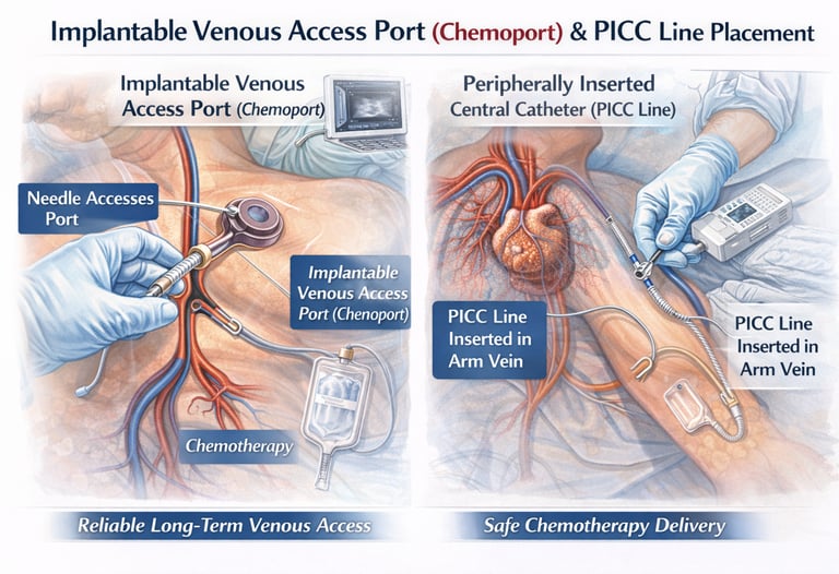 Implantable Venous Access Ports (Chemoports) and Peripherally Inserted Central Catheters (PICC lines) are minimally invasive, image-guided vascular access devices placed into large central veins under ultrasound and fluoroscopic guidance. These devices allow secure delivery of chemotherapy, medications, blood products, and nutrition while reducing discomfort and complications associated with repeated injections.
