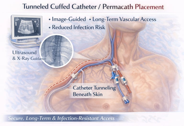 A minimally invasive, image-guided procedure to establish reliable long-term venous access for dialysis or prolonged therapy, ensuring secure catheter positioning, reduced infection risk, and improved patient comfort.