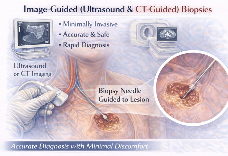 Precise, minimally invasive biopsy procedures performed under ultrasound or CT guidance to safely obtain tissue samples from deep or difficult-to-reach lesions, ensuring accurate diagnosis with minimal discomfort and low complication risk.