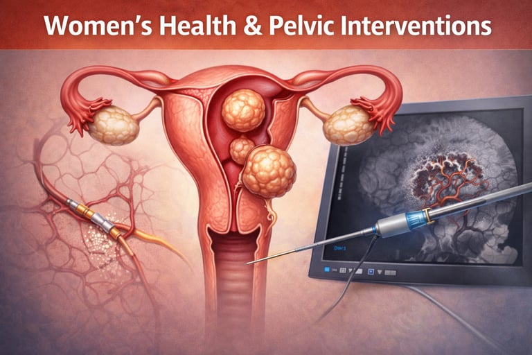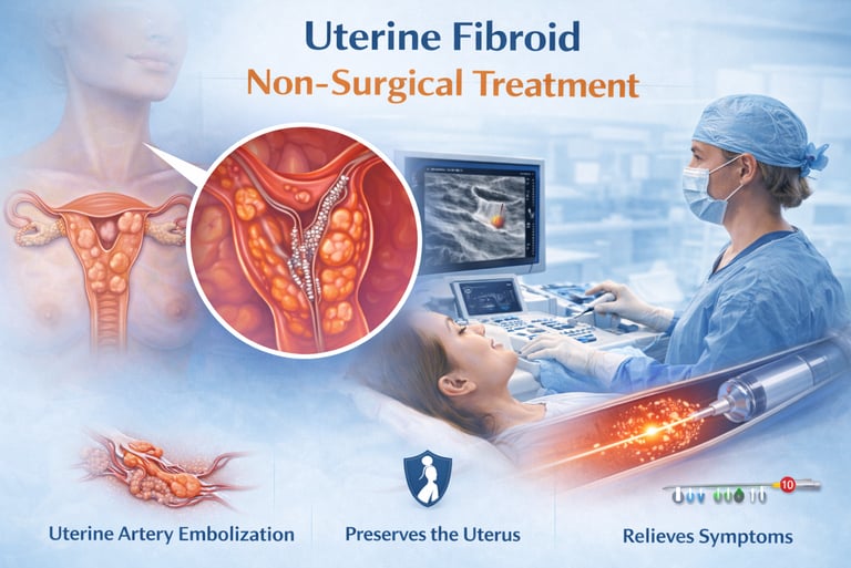 Uterine Fibroid Embolization in Pune (UFE), a minimally invasive treatment for fibroids performed by Dr Abhishek Bairy, Interventional Radiologist in Pune. UFE helps reduce heavy bleeding, pelvic pain, and pressure symptoms while preserving the uterus and ensuring faster recovery compared to surgery