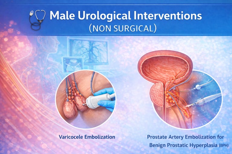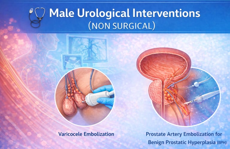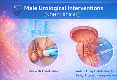 Advanced, minimally invasive, image-guided treatments for common male urological conditions that avoid open surgery. These procedures are designed to relieve urinary symptoms, control bleeding, and improve quality of life while preserving organ function. With precise targeting, minimal discomfort, shorter hospital stay, and faster recovery, they offer safe and effective alternatives to conventional surgical approaches.